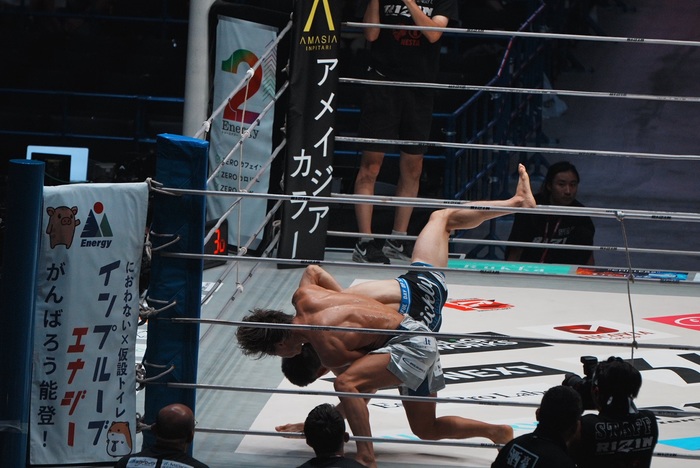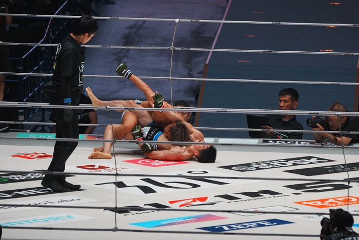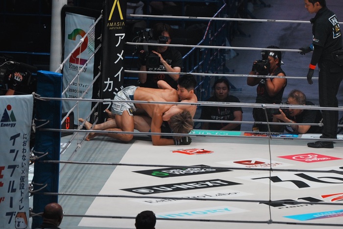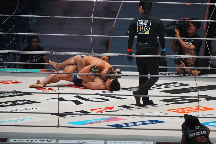 1R、両者軽快なフットワークから佐藤は横蹴り、小林はダブルレッグに行く。リフトアップされた佐藤はフロントチョークの体勢に。そのままテイクダウンした小林だが佐藤は首を離さない。ニンジャチョークに移行した佐藤だがこれは極まらず。サイドについた小林の首を脇に抱える。