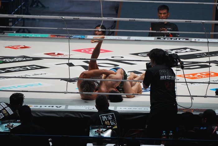 立ち上がる佐藤を離さない小林に佐藤はヘッドロック。そのままグラウンドとなり、小林がバックをとる。佐藤は背後にヒジを打って腕関節を狙ったが、小林が上になる。それをブリッジで返した佐藤、小林は立ち上がる。スタンドに戻ると小林が左ハイ、その蹴り足を受け止めた佐藤は組み付いてバックをとり、グラウンドになったところで初回終了。