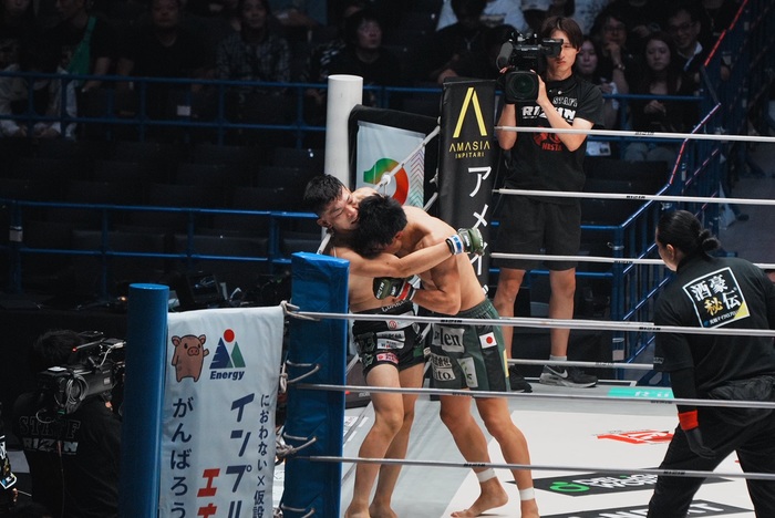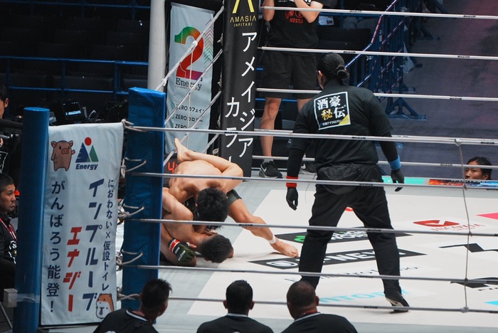 スタンドに戻ると脇田のタックルにヒザを合わせるYUHEIだが、そのまま脇田がダブルレッグでテイクダウン。YUHEIにはロープをつかんだ行為で注意が与えられた。
