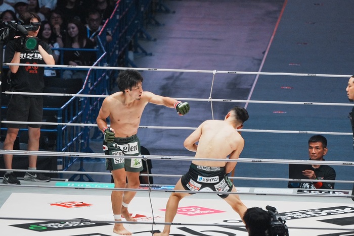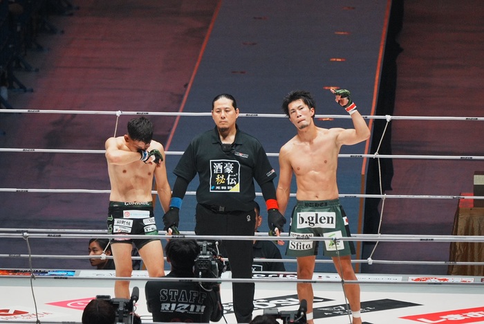 YUHEIは左ストレート、左三日月の連打からワンツー、さらに左ハイ。打撃で圧倒された脇田だが、左右フックを振り回して組み付く。四つの体勢からテイクダウンを狙うが、YUHEIは左腕で小手を巻き、投げで逆にテイクダウン。試合終了間際にヒジを落とした。