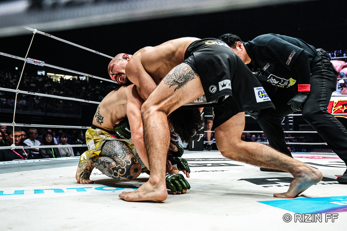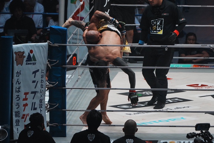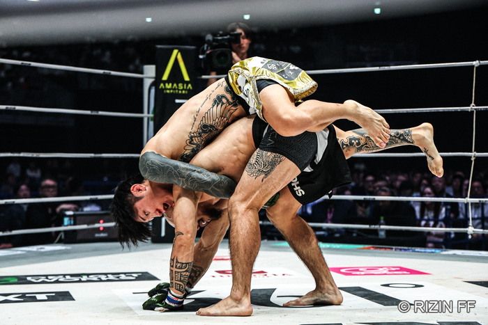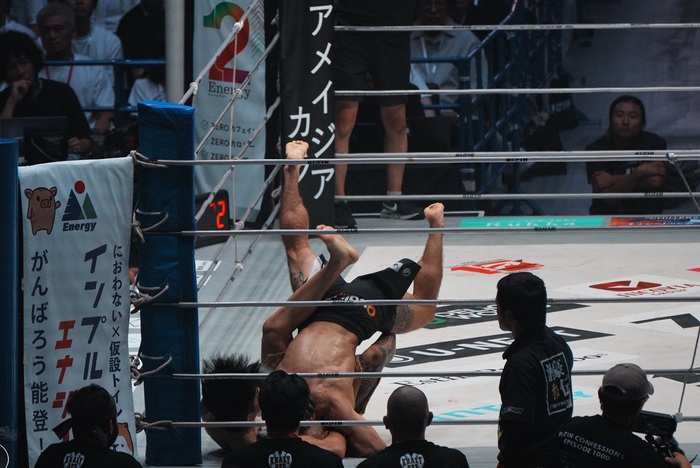 三角絞めを狙う伊藤だが、中腰で押し込むアーセン。左右パウンドを入れると、そこで立ち上がる伊藤になおもシングルレッグ。それをネルソンで差し上げる伊藤に、反転してトップを奪うのはアーセン。サイドバックからクラッチをし続けるアーセン。なおもリフトするとギロチン狙う伊藤にテイクダウン! 立つ伊藤をがぶり倒してノースサウスを狙ってゴング。