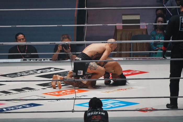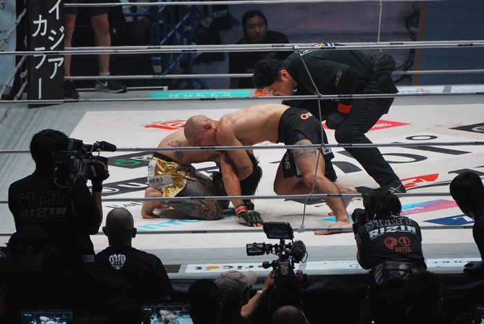 ボディから左ストレートの伊藤。さらに左でアーセンのアゴを浮かせるが、前のめりの打ち終わりに組むアーセンがシングルレッグの伊藤に腹固め。さらに寝かせて背中を着かせて押さえ込んで細かいパウンド。