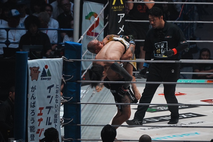 1R、伊藤の右にいきなり詰めたアーセンが、ダブルレッグも差し上げる伊藤に首相撲ヒザ。突き放す伊藤になおもダブルレッグのアーセンはパウンド。伊藤のバックを奪いシングルバック。抜けて立つ伊藤にサイドバックからヒザ。伊藤はコーナーまで歩いて、バッククリンチのアーセンを外して正対し、スタンドに戻すと、アーセンの入りにヒザ! しかし、その蹴り足もt間でテイクダウンするアーセン。伊藤は鼻血。