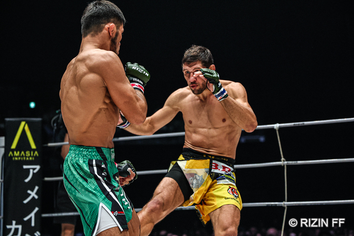 セミファイナルの第13試合「RIZINフェザー級(66kg)タイトルマッチ」では、15戦無敗の王者ラジャブアリ・シェイドゥラエフ(キルギス)に、MMA9連勝中のビクター・コレスニック(ロシア)が挑戦した。