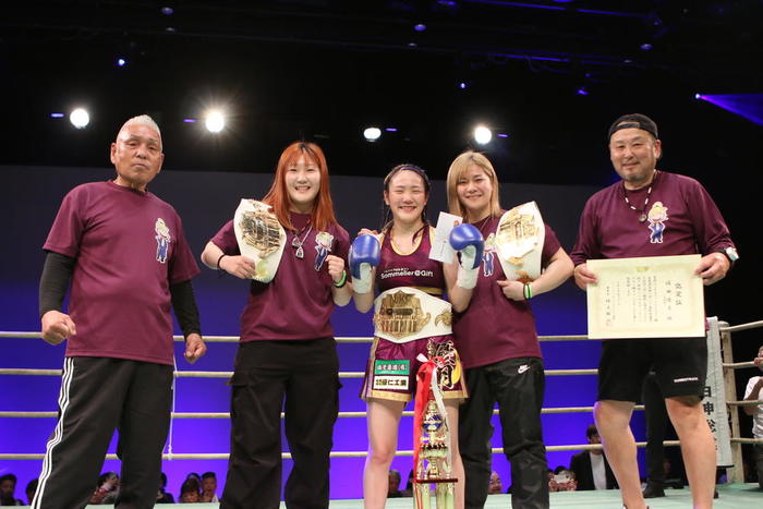 【写真】K-1女子フライ級王者のSAHO(右から2人目)の後輩であり、同門の珠璃(左から2人目)もミネルヴァ王者(C)NJKF拳之会