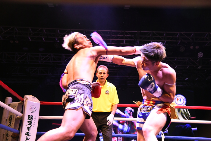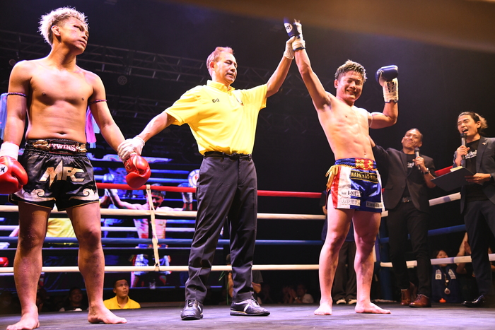 展開が膠着しつつ迎えた最終R、若干動きが鈍ってきたエークモンコンに対し天野は接近戦を仕掛け縦ヒジを強振! 中盤はお互いヒジの打ち合いとなり、場内は大盛り上がり。エークモンコンがハイキックを見舞うと運動量の落ちない天野はバックハンドブローを返し、ラスト30秒はパンチでラッシュしてお互い激しい打ち合いに。