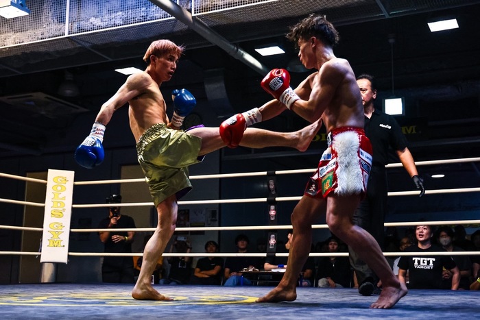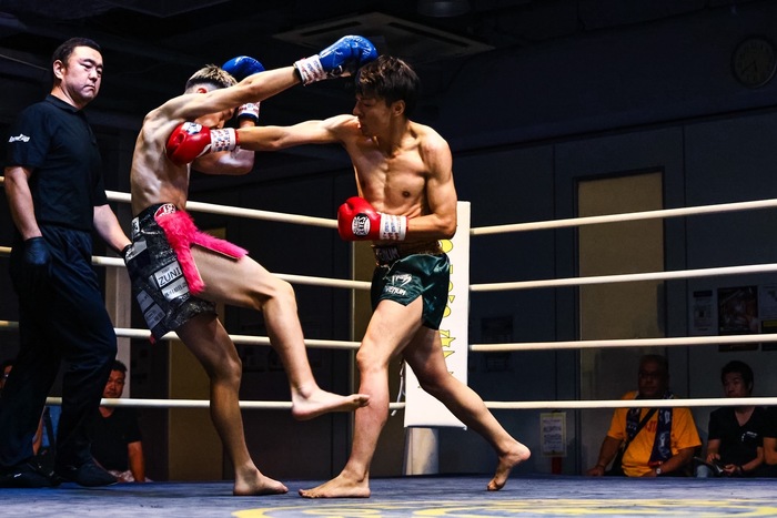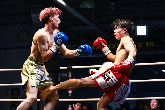 2R、日原が右ロー連打。新井が打ち合いを誘うと、日原も一歩も退かない。日原がガンガン前に出てコーナーに追い込みパンチ連打すると、新井にドクターチェック。再開後、新井の連打がヒットする。
