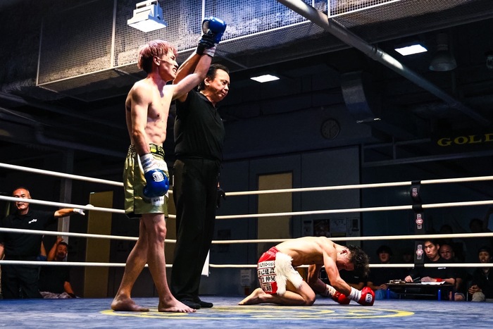 1R、深見が右ロー、細かいパンチで前進し、金山は右ローを返す。パンチを振り回す深見は右ストレートでダウンを奪う。立ち上がる金山を仕留めにかかった深見だが、1R終了のゴング。