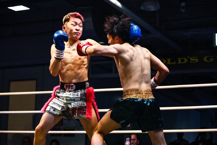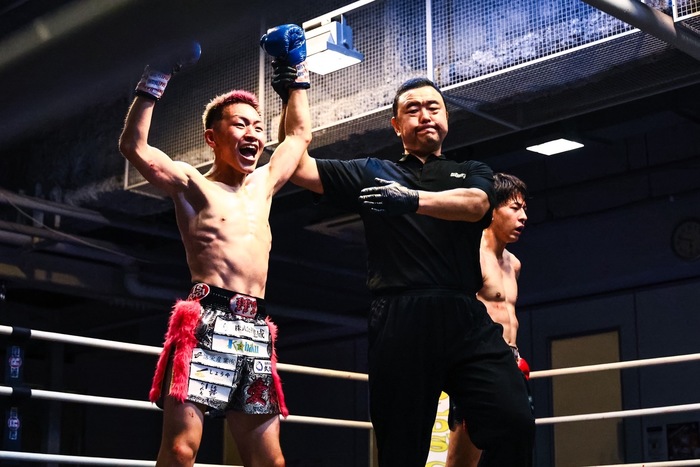 3R、お互いに前に出て打ち合う展開。日原が新井をコーナーに詰めてパンチ連打、左ハイ。耐える新井は出血が激しく、2度目のドクターチェックが入った。再開後、打ち合いから新井は飛びヒザ。最後まで日原が仕留めにいく姿勢を見せたが、時間切れ。新井が判定勝ち。