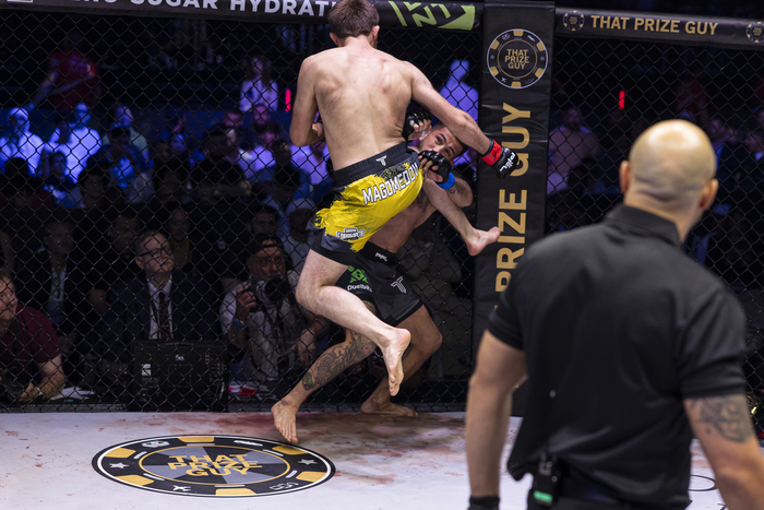ハビブ・ヌルマゴメドフがセコンドについたダゲスタンのマゴメドフは21勝4敗(3KO・TKO/11一本勝ち)の33歳。22年に行われたBellatorバンタム級GP準決勝で優勝したミックスにギロチンで一本負け。23年のBellator日本大会ではダニー・サバテロにギロチンで1R 一本勝ち。24年5月にミックスと再戦し、組み負けず打撃を効かせるもスプリット判定負け。25年6月の前戦では、当時無敗のサルバドン・ハミドフに判定勝ちしている。