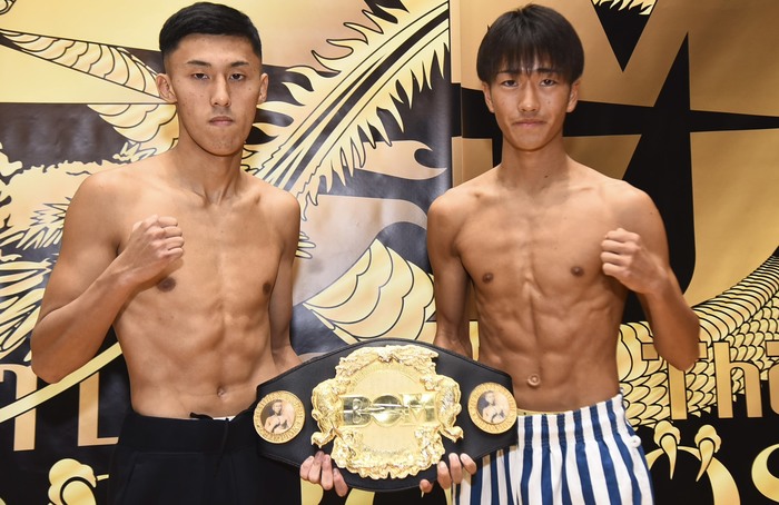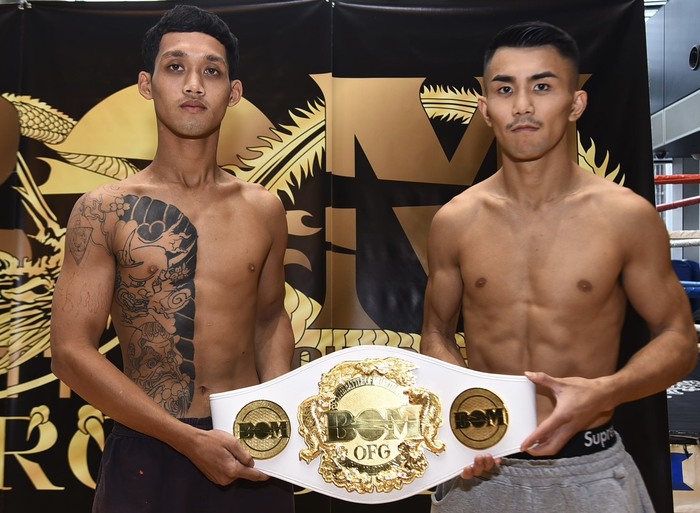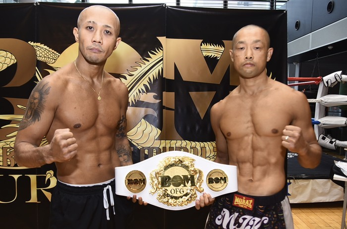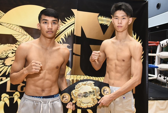 第4試合、BOM OFGフェザー級(-57.15kg)王座決定戦で対戦する朝陽・エイワスポーツジム(=品川朝陽/エイワスポーツジム)は56.92kg、サイペット・ソーウィサヌポン(タイ)は56.60kgで計量をクリアー。