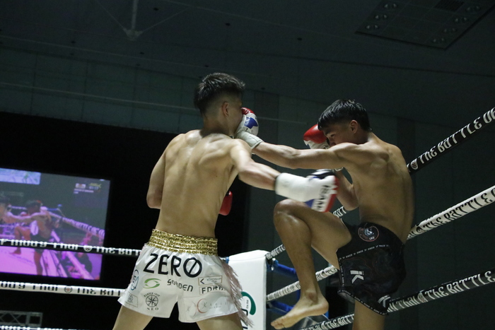 1R序盤からどんどん前へ出て右ミドルを中心に攻撃していくケンサイアム。吏亜夢は右ボディ、ヒザ、右ミドルとケンサイアムのボディを攻めていく。