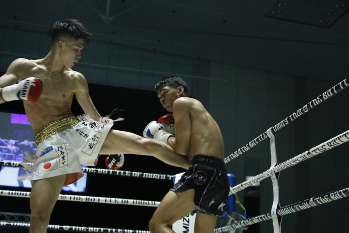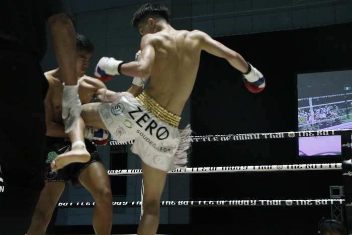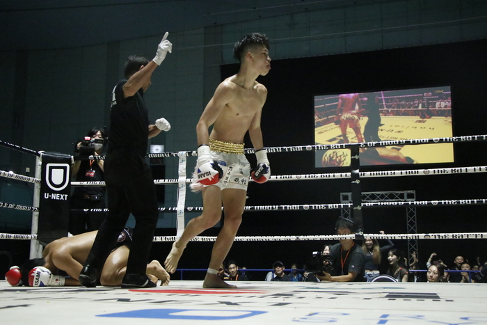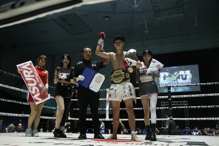 このボディ攻めで前へ出られなくなってきたケンサイアム。吏亜夢のボディ攻撃は続き、左ヒザがボディにグサリと突き刺さるとケンサイアムは悶絶。吏亜夢がベルトを巻いた。