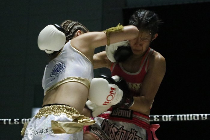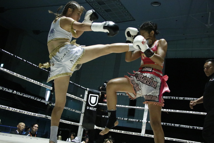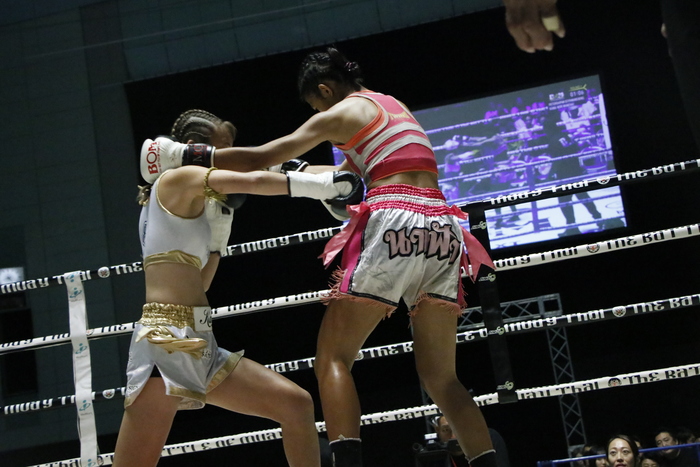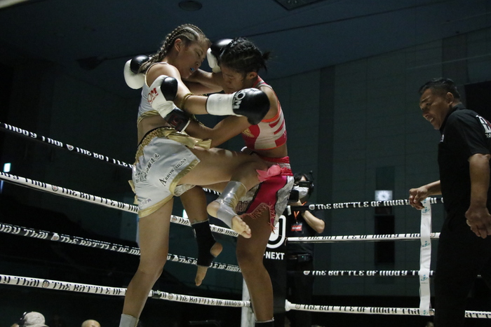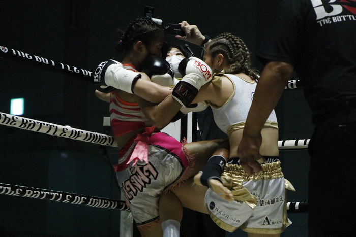 3Rも組んでくるペットサイパーンにカナは左右ストレート連打で抵抗。組まれる前にパンチを当てるカナだが、ペットサイパーンは組んでのヒザ、そして蹴り終わるとヒザでカナの両足を抑えて攻防を終わらせる。