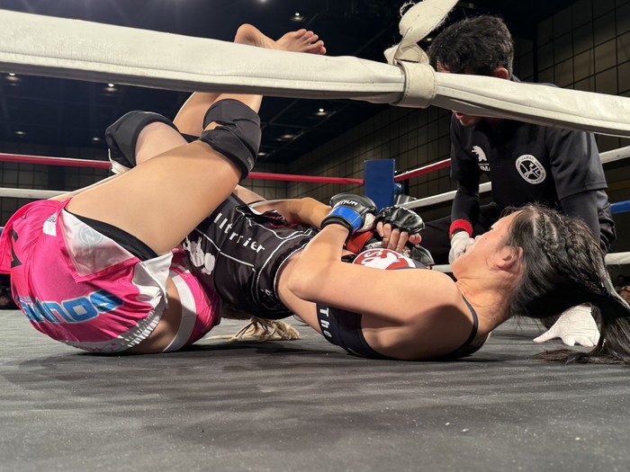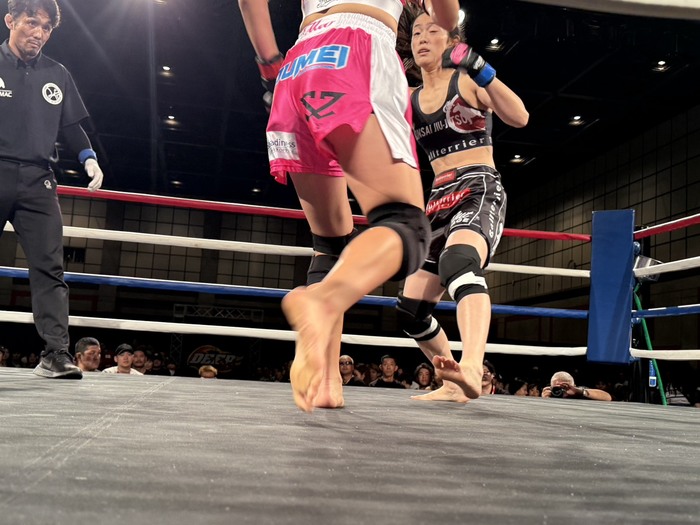 1R、右ローの真央に、花美も蹴りからダブルレッグテイクダウン。サイドを奪う。右手で花美の頭抱える真央は片足をからめるが、右でパウンドの花美は頭を抜き、腕十字に。ヒジが伸びるが、レフェリーが少し見てストップした。
