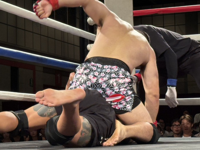 佐藤がダブルレッグテイクダウンからバック奪いリアネイキドチョーク。