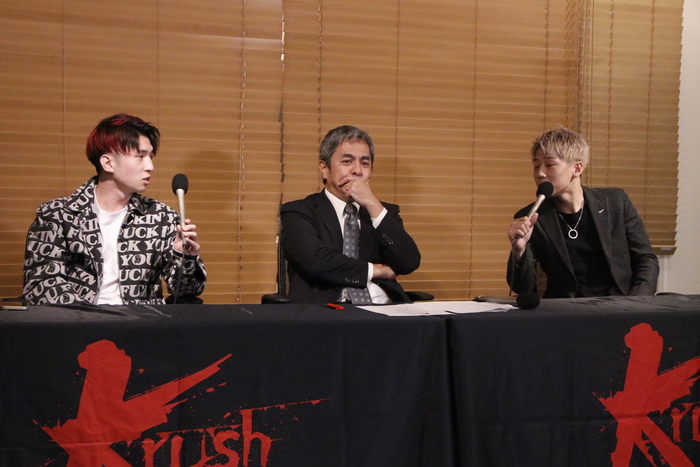 これに心直が「何を持って盛り上がるかですね。今の感情だったら、僕は思うんですけれど、Xでやり取りして試合が決まりました。そこでスポンサー、親御さん、ジムの関係者とかそっちは盛り上がるかもしれないけれど、Krush後楽園が盛り上がるかと言ったらそんなことはない。今日の会見までにもっと出来たことがあると思うし、盛り上げ方もプロフェッショナルじゃないな」と上から目線で絡み始めると、大平は「黙れ、うるさい」と心直の言葉を遮る。