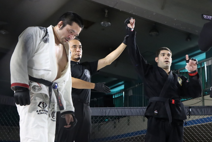 道衣MMA。1R、サウスポー構えの西村は右ジャブ、左ロー。オーソのラングはワンツーの右ストレートから組んで道衣を掴んで首相撲ヒザ。強い右ミドル。西村はシングルレッグで押し込むも、ケージで凌ぐラングに左足シングルに移行する西村。その背中にラングはパウンド、ヒジを落とす。ブレークに、ラングは右ハイから左右ラッシュで攻めてゴング。