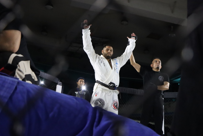 対するハシモト・ブランドンはGRACHANを主戦場に活躍する選手。そのファイトスタイルはまさにJAWSの如き獰猛さでBULLSHARKが獲物を引き千切る姿を想像させる。8月10日のGRACHAN75で見事KO勝ちしたブランドンをケージ下から見つめるのはGRACHANスタッフの田馬場。その両者が道衣MMAで激突する。