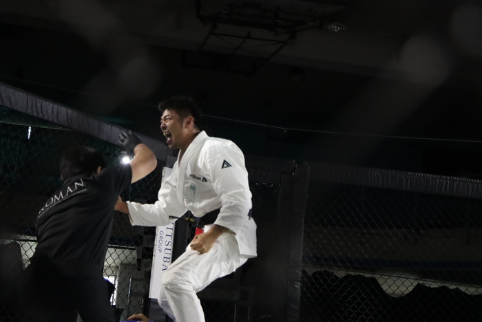 ROMAN柔術、ハーフのランジェルに市川は手首を掴んでパス、キムラで回してタップを奪った。