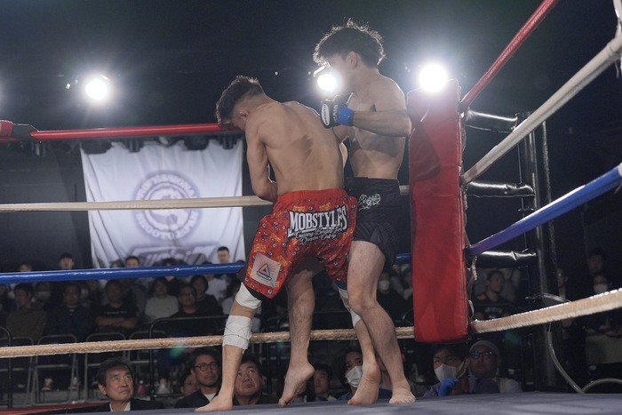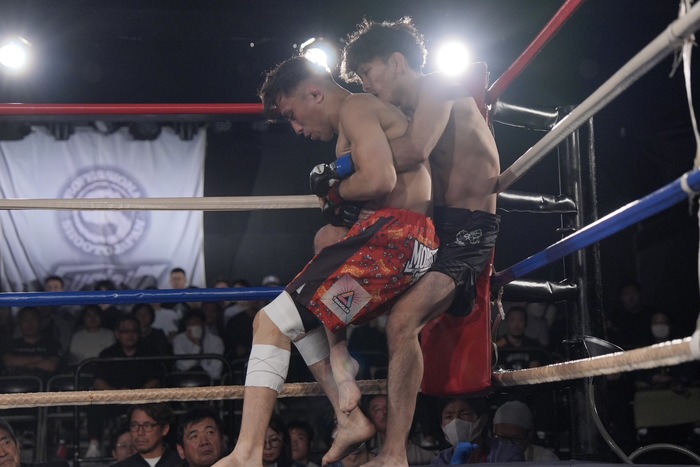 3R、ローの川北。ジェイクはもワンツー。左フックの川北に、ジェイクは左右で詰めるが、組む川北が押し込み。コーナー背にするジェイクに、川北が下に入ると差し上げるジェイク。川北は首相撲ヒザとヒジ。