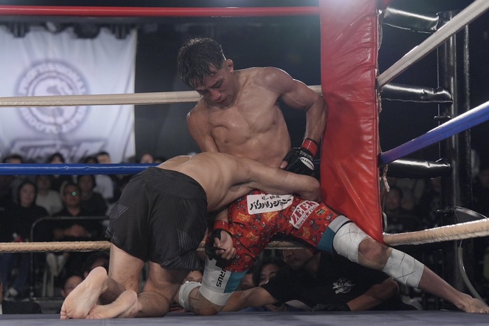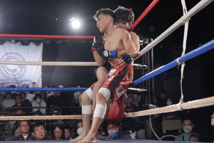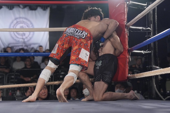2R、中央を取るジェイク。右カーフの川北、右ストレートを当てて回る。詰めるジェイクはコーナーに押し込み、右フック。しかし体を入れ替える川北が右で差して押し込み。ダブルレッグに尻を着きながらもすぐに立つジェイク。右で差して押し込み小外がけで崩しも、上半身が外に出る川北が、逆に押し込み、ボディロックからサバ折り気味に崩し、すぐにコーナー使い立つジェイク。
