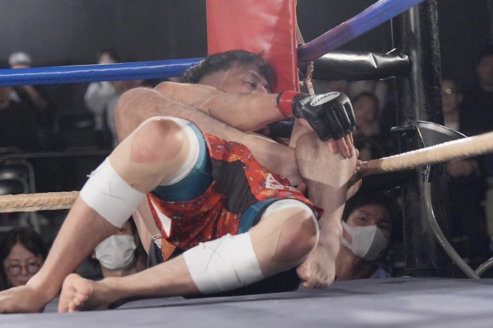 右で首を抱えるも首抜く川北が右を振って組み。右差しのジェイクが首を抱えてクラッチも、ロープの間で尻を逃がす川北。ジェイクはネルソンで詰めてヒザを突いてゴング。拮抗したラウンド。