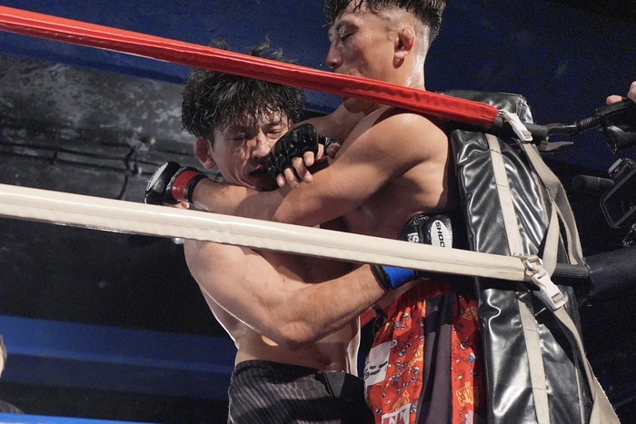 正対した川北はすかさず低いダブルレッグに。足を伸ばして差し上げたジェイク。首相撲から離れて中央で打ち合いを望んだジェイクに、川北は右を突く。ジェイクの打ち返しにさらに右を突いてゴング。