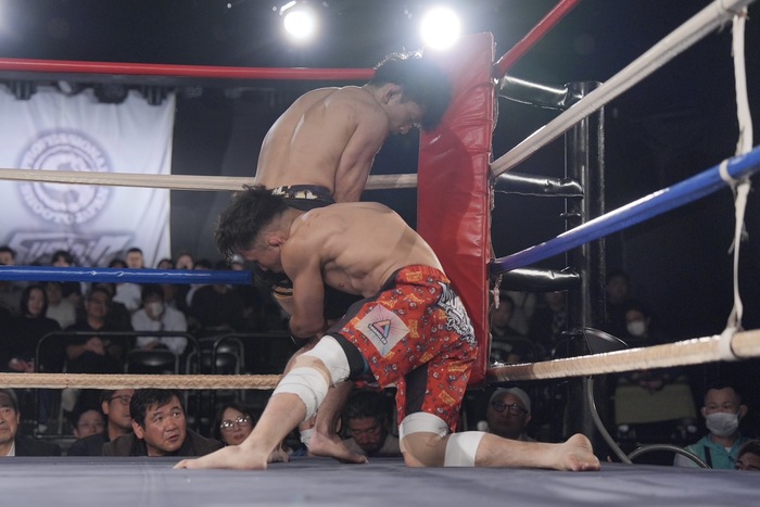右から左の川北に、ジェイクも左右。押し込んで川北に、体を入れ替えたジェイクはボディロックから崩し。残してコーナーに頭をつける川北。