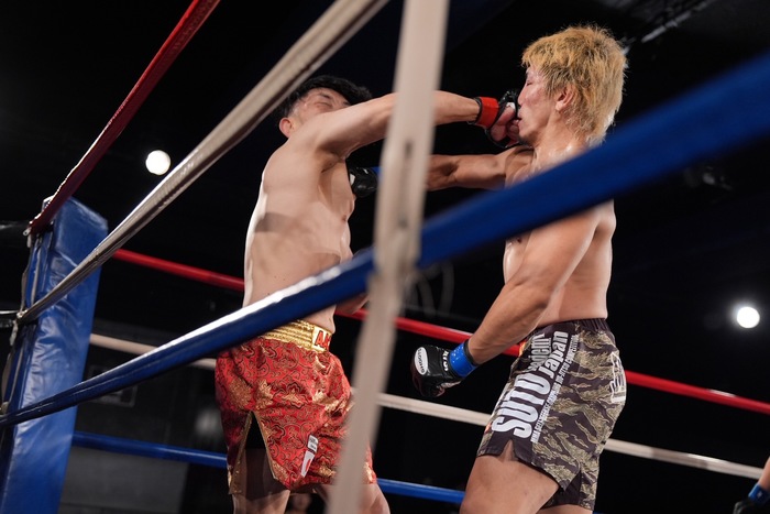 2R、右ローの澤江。井口の打ち返しに右を当てるが、詰めて組む井口が左で差してコーナーに押し込み。前に煽るも、クラッチを外した澤江は向かい合い長い右を突いて右ヒザ、出入り。