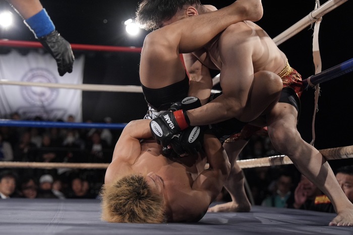 1R、サウスポー構えの井口がテイクダウンも下から腕十字の澤江。それをかつぎパスの井口が背中見せて立つ澤江のスタンドバックに。正対して離れた澤江が右ストレート、さらに左を当てて右ローも突いてゴング。