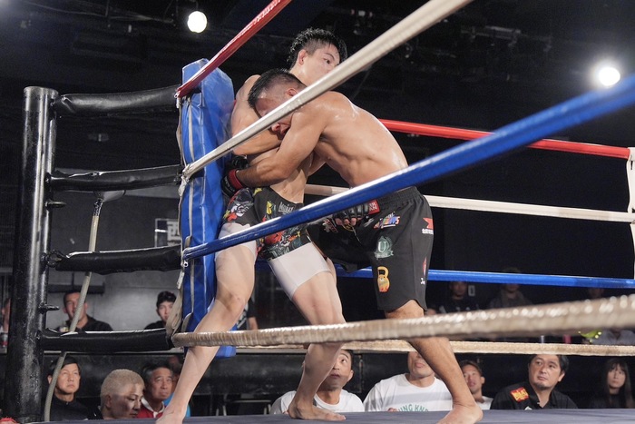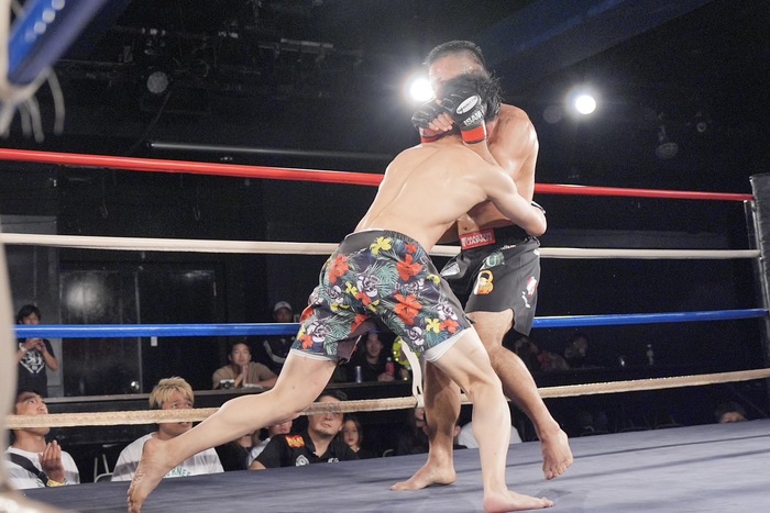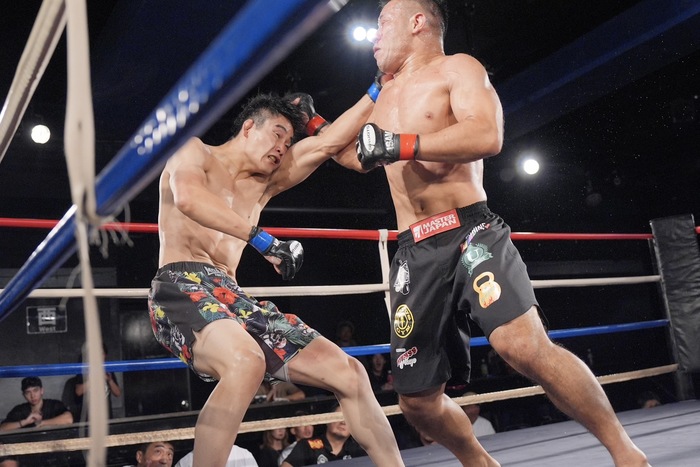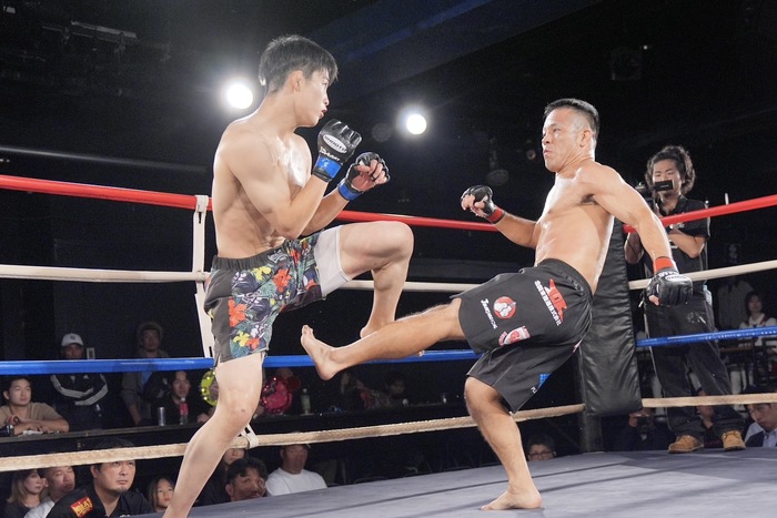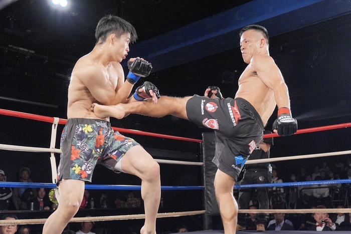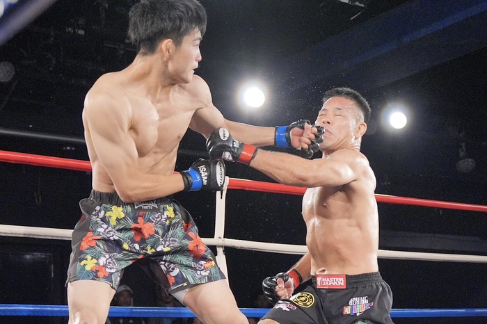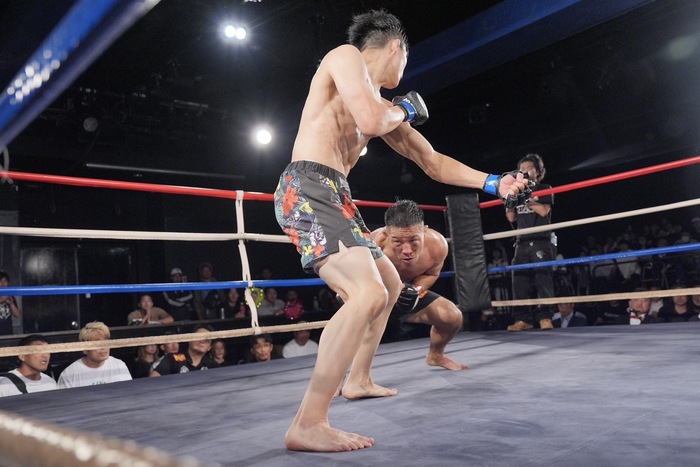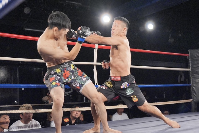 左インロー、前蹴りの平川。青井も右前蹴り、ワンツーの右がヒット! ワンツーで入る平川は青井の打ち返しをダックでかわす。
