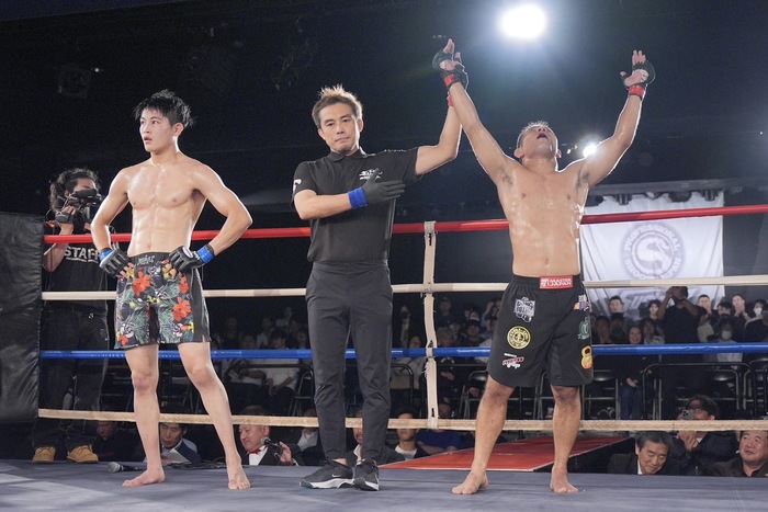 判定は2-1(29-28×2、28-29で平川が勝利。接戦を制した平川は「マスタージャパン東京、フィットネスショップ水道橋店長の平川智也です。心技舘の青井心二選手、師匠にあたる遠藤雄介さん、ずっと見てきて、(ラスカル時代の師匠の)五味(隆典)さんとの繋がりもあって、自分のなかでは“修斗伝承”だと思って、ずっと準備してきました。明日は子供の運動会、『勝ったぞ!』。タフファイトを制せて良かったです」と語った。