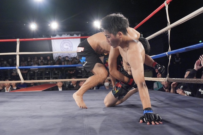 レベルチェンジを見せて入る平川は左フック、右フック。さらに左を突いてからダブルレッグへ。スプロールする青井に先に頭を上げてがぶりは平川。
