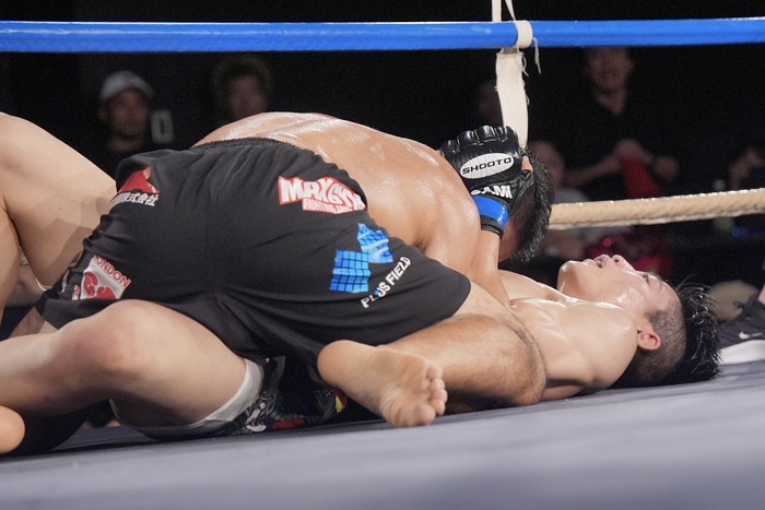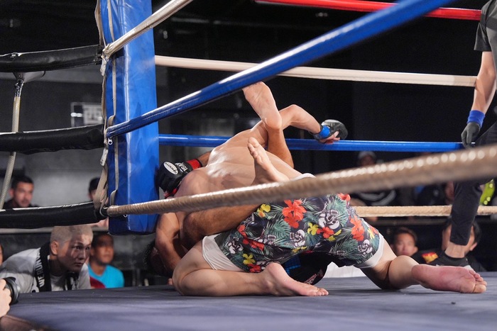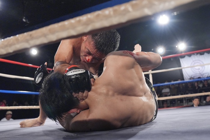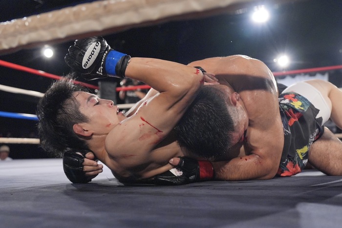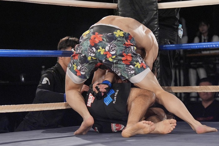 右ストレート、右の蹴りの青井の圧力に潜って組んだ平川。ボディロックから小外刈テイクダウン! サイドに回った瞬間に青井がスイープで上に。残り20秒。平川は顔面から出血。足をさばく青井に、平川も立ち上がりゴング。平川のラウンドか。