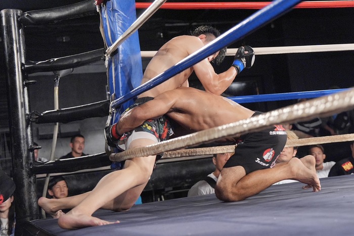 3R、右のストレート、右蹴りの青井に、平川も左右で前に。レベルチェンジを見せて青井の左フックを潜って入るが、そこに青井はシングルレッグで尻を着かせる。コーナー背にすぐに立つ平川。首をがぶり、ブレーク。