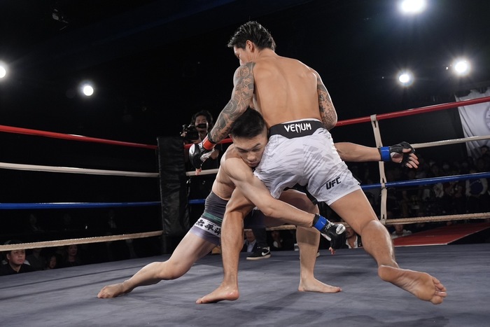 1R、左インローの有松に福元はシングルレッグ崩してバッククリンチに。崩しに思わずロープを掴む有松に福元はなおも崩してテイクダウン!
