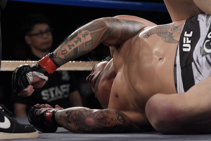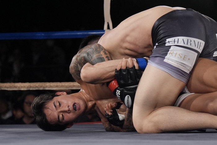 腰を引いて足を戻して立つ福元。ともにワンツーが交錯も、左右を大きく振る有松に福元がテイクダウン。半身になる有松は亀になるも寝かせる福元は身体を伸ばしてリアネイキドチョーク。有松が落ちた。福元は3戦3勝3フィニッシュで決勝進出。