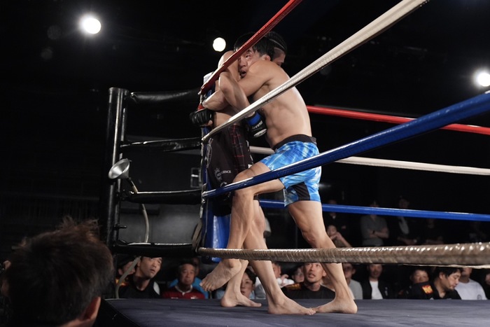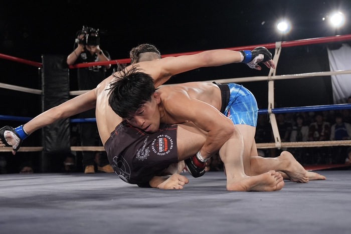 2R、松下の組みを外して右カーフの菊西は前に詰めて前蹴りも、その打ち終わりにダブルレッグテイクダウンは松下。菊西を寝かせてハーフにするが、足を戻した菊西はフルガードに。インサイドガードから細かくパウンドの松下に、足を抜いて立とうとする菊西。その腰を抱いてハーフで寝かせる松下はパスガードしてサイドに。サイドバックからパンチ。立つ菊西をコーナーに詰めてボディロックで回してテイクダウン!