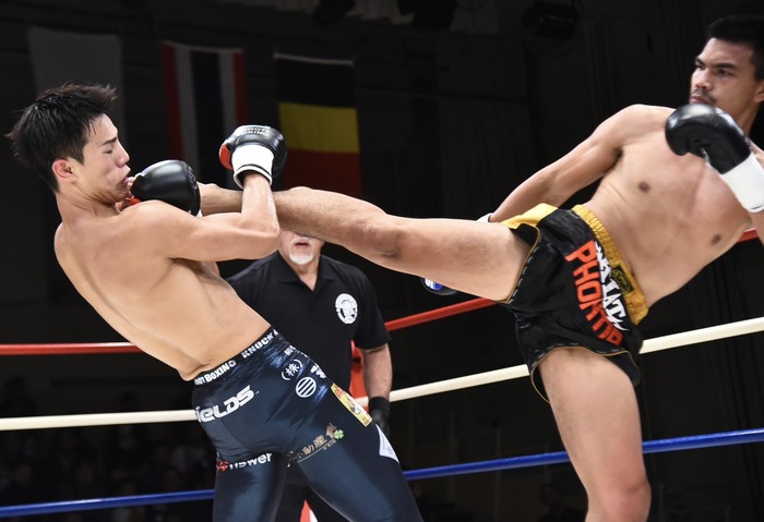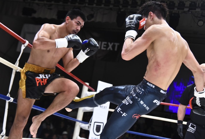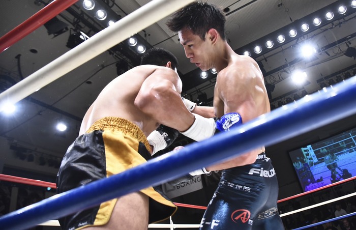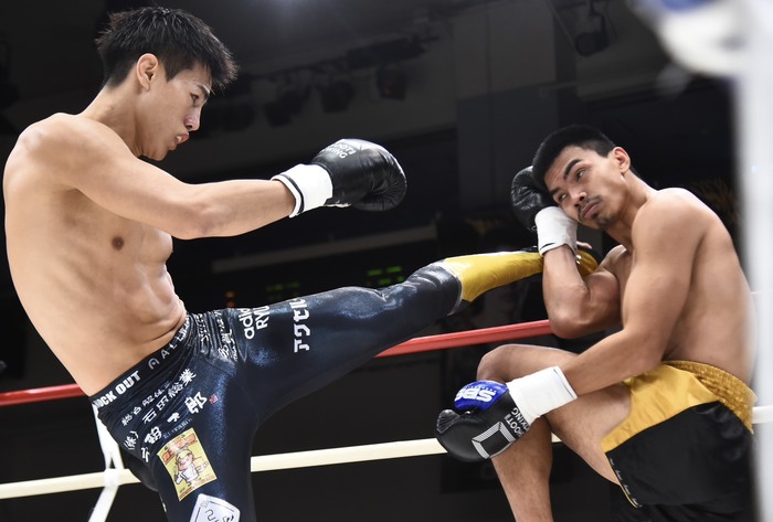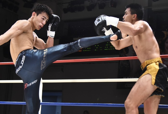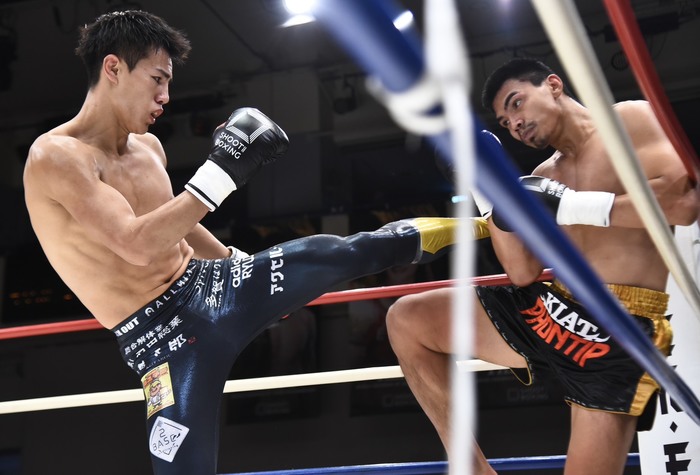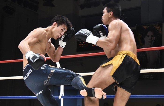 2R、海人の右ストレートに前蹴りを返して尻もちをつかせるペットマイ。前に出る海人に左右ボディを打つ。ロープを背負うペットマイだが海人を前蹴り連打で遠ざけ、カーフを足を上げてディフェンス。