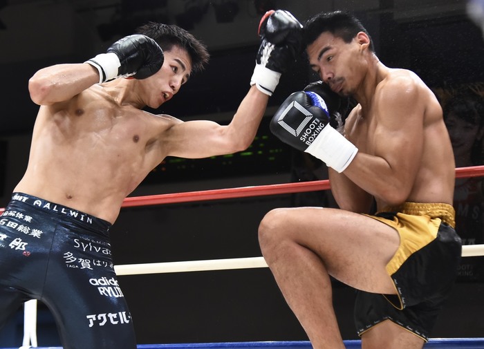 海人が右カーフを蹴ると、左フックをリターンするペットマイ。強い右カーフを決めていく海人は、それをフェイントに左ヒザを突き刺す。サウスポーになる海人は左インローを連打していき、左ヒザを突き上げる。