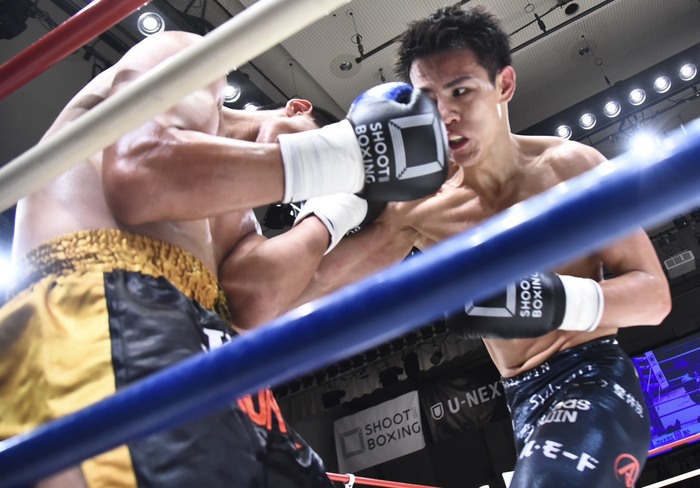 1R、海人はジャブを突いての右カーフを積極的に蹴っていく。ペットマイは右ストレートから右ハイも海人はかわす。海人がロープを背負わせてのワンツー・左ボディ、ヒザ。