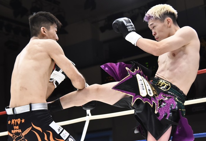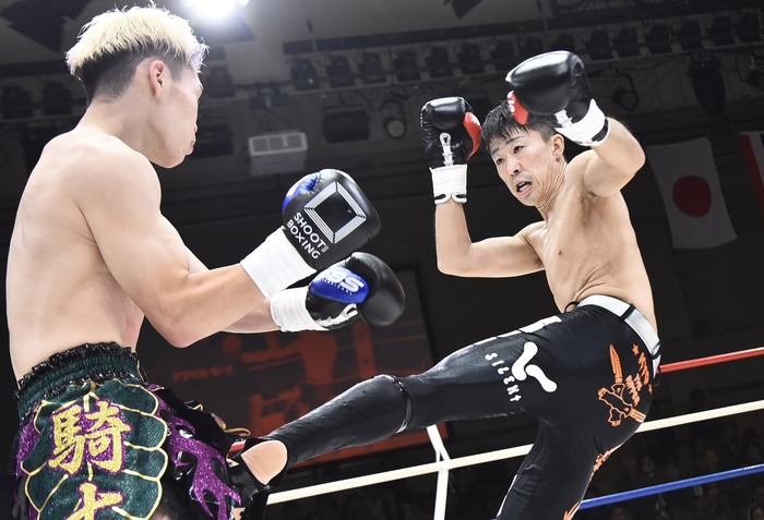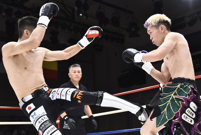 1R、サウスポーの川上はジャブと左インロー、相手の左側へ動いて左ストレート、右フックを打つ。牧野は右インローと右インカーフを蹴り分ける。川上はジャブを当て、見えにくい角度からの右フックを打つ。川上の左インローがローブローになって中断。再開後、すぐにラウンド終了に。