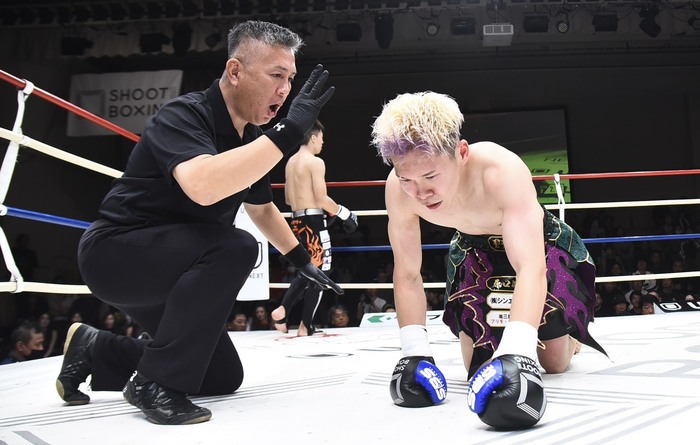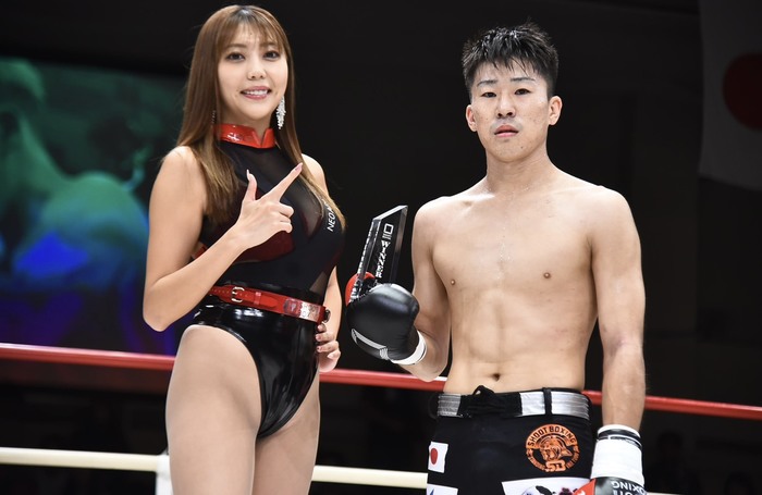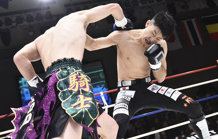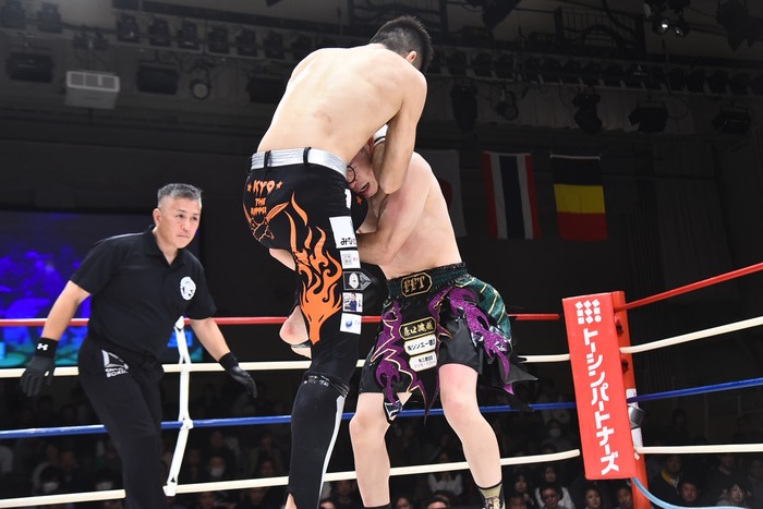 2R、首相撲に捕まえた川上はヒザ蹴り連打から崩してコカす。川上は再び首相撲からのヒザを見舞うと、ボディへの左ヒザで腹をかばった牧野のアゴへ左ヒザを突き上げた。ダウンした牧野は立ち上がろうとするも身体が言うことをきかず、川上の見事なKO勝ちとなった。
