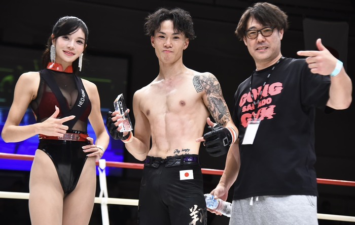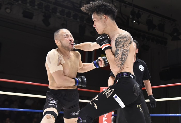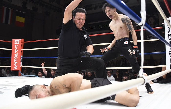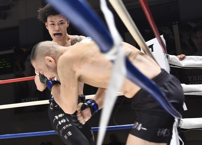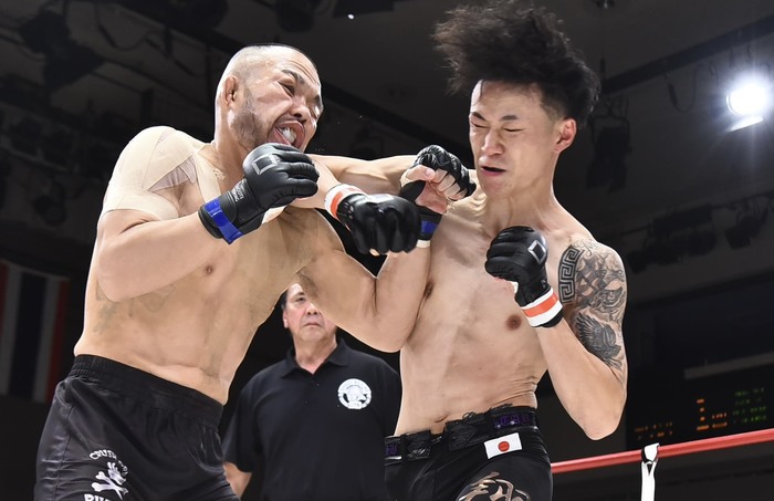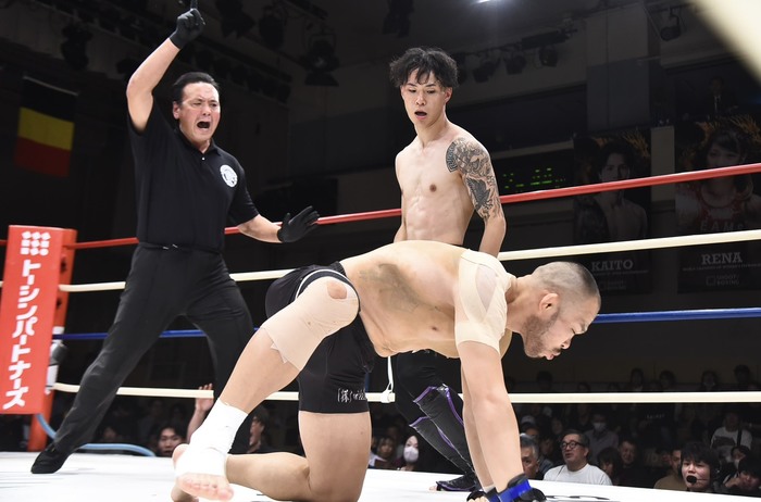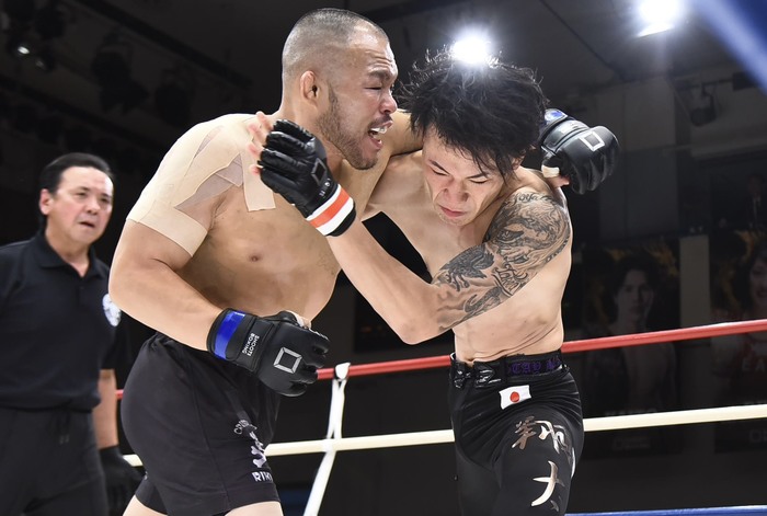 1R、序盤からパンチで前へ出ていく樋沼だが、手塚が引き込んでの右フックでダウンを奪う。それでも突進してパンチを見舞おうとする樋沼を手塚は組んでの投げ。樋沼も投げを狙おうとして投げの応酬に。