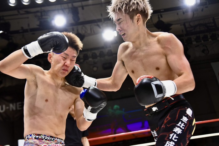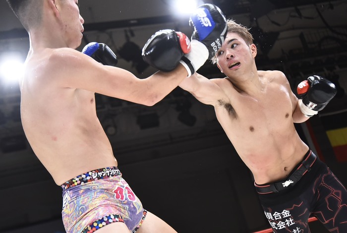 2R、前に出る中田に左フックと右ストレートを直撃させる笠原。中田は組み付くと投げを仕掛けるが失敗。右ミドルを蹴る笠原に打ち合いを仕掛ける中田は組みも混ぜて投げのモーションに入る。