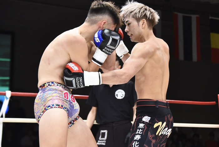 3R、笠原は崩し技で中田をコカすが、中田は何度も組み付いての投げを狙ってくる。笠原が左ボディ、中田は左フックから組み付く。笠原が腰に腕を回しての投げを放つが、これは不十分。笠原の強烈な左ボディが決まるが、中田は下がらず前へ出て左右フック。笠原のワンツーに中田はワンツーを返すが空振り。