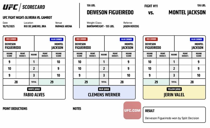 #UFCRio Official Result: Deiveson Figueiredo (29-28, 29-28, 29-28 | @Daico_Deiveson) defeats Montel Jackson via Split Decision.