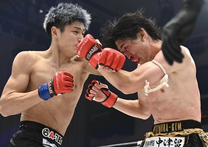 古村の右フックを空振りさせて左を打つ久井。完全に久井ペースで進んでいたが、左カーフを蹴った久井に右フックを合わせた古村がダウンを奪う。前に出る古村に久井は左ヒジ、古村は前蹴りから前へ出るが深追いはしなかった。