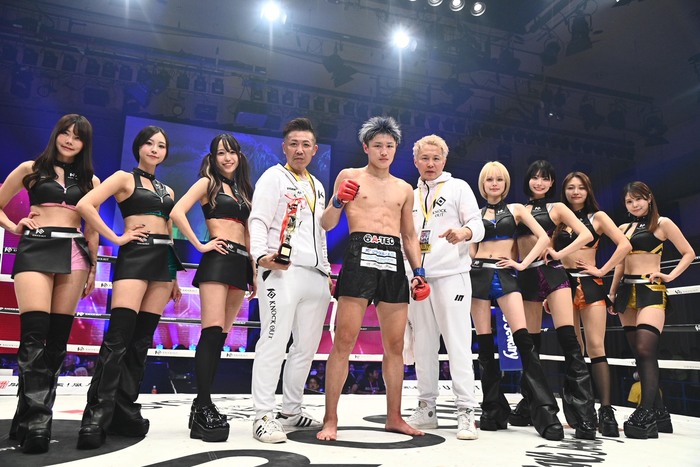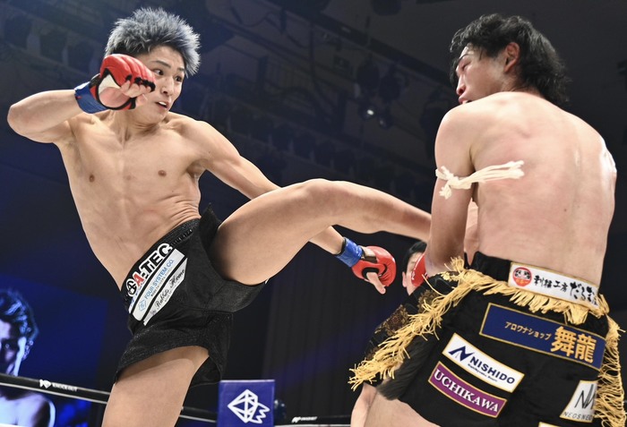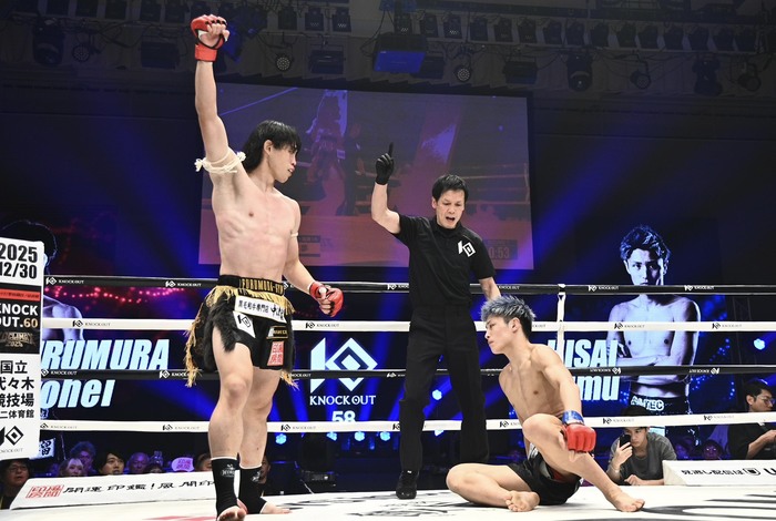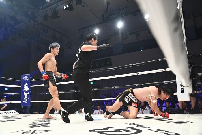 さらに古村の右をかわして左フックを当てていく。ジャブから再び飛び二段蹴りを見せる久井。左三日月を突き刺し、左ストレート、組むとヒザ蹴り。またもジャブを突き刺してからの左ストレートを打ち込み、ダウンを奪う。ここでレフェリーが試合終了を宣言した。